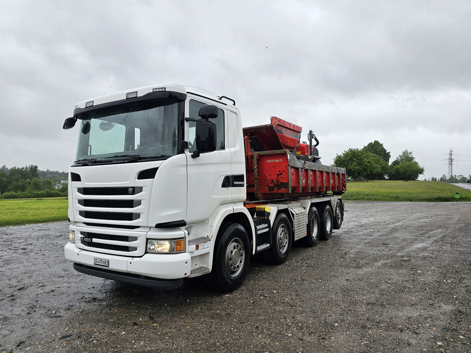Für unseren 5-Achser besitzen wir verschiedene Mulden und Pritschen. Für Aufbauten welche Hydraulikleistung benötigen ist ein Schnellkuppler am Nebenantrieb des LKW’s angebracht. So können wir beispielsweise unseren Abschiebecontainer betreiben. Dieser hat ein Ladevolumen von 40m³ und ist mit Abdecktüchern versehen, um kein Transportgut zu verlieren.  Der Abschieber hat einen Überhäckselschutz nach vorne um die Kabine besser zu schützen. Somit ist er hauptsächlich auf Hackschnitzeltransport ausgelegt. Mit der Funkfernbedienung können wir ausserhalb des LKW’s stehen und den Abschieber steuern.