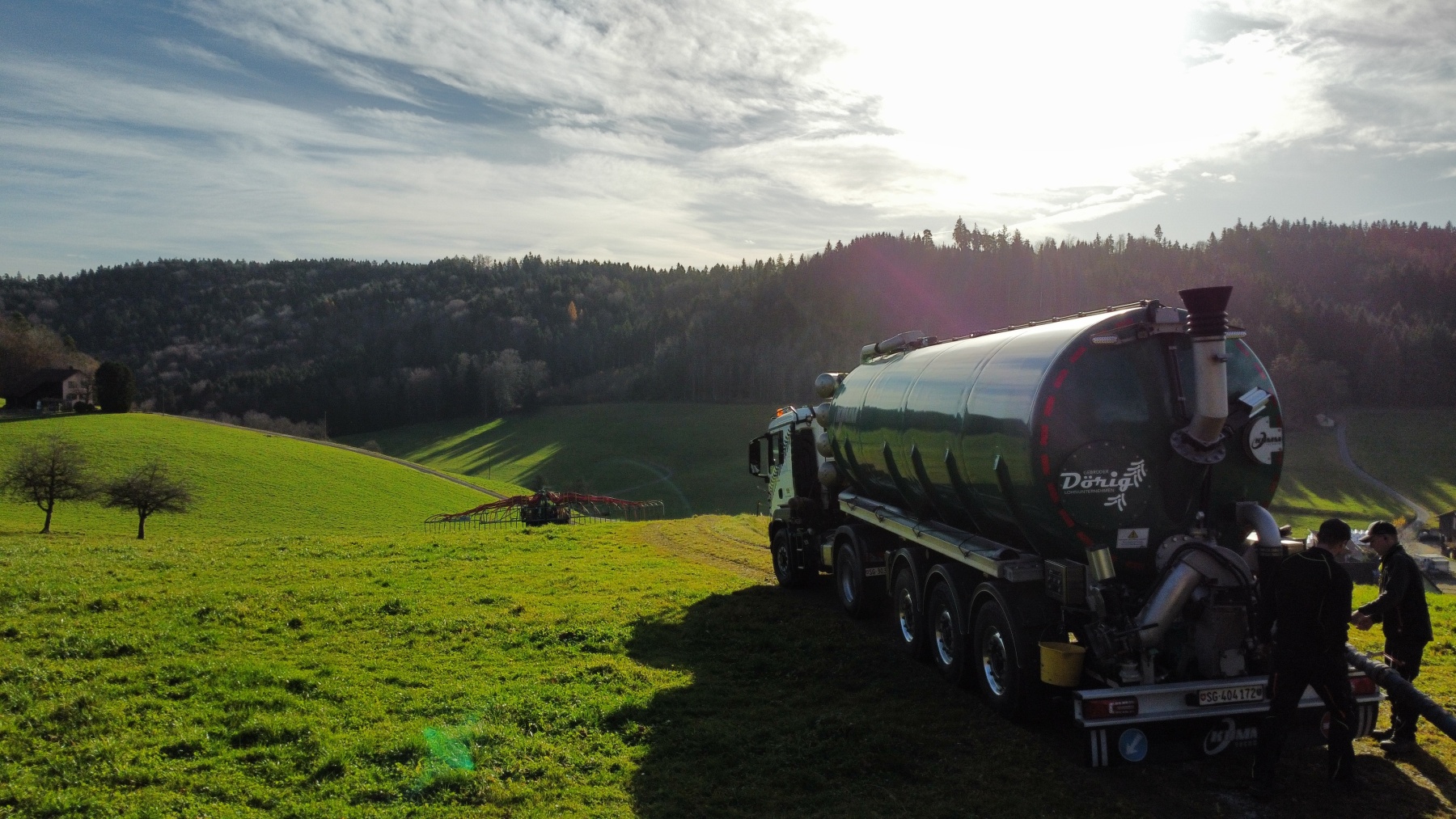 Mit 28m³ Zuladung transportieren wir Ihre Gülle schlagkräftig und zuverlässig. Mit aufgebauter Verschlauchungspumpe sind wir in der Lage direkt ab Fass zu verschlauchen. Transporte von Loch zu Loch sind ebenfalls möglich. Die leistungsstarke 6000l/min Drehkolbenpumpe ermöglicht uns ein effizientes be- und entladen des Fasses. Während der Fahrt können wir umrühren oder falls nötig sogar umspülen, sodass auch Gülle mit viel Satz keine Chance hat, sich festzusetzen. Unser MAN verfügt über einen Hydrodrive (Allrad) welcher es uns ermöglicht auch Kiesstrassen zu befahren.